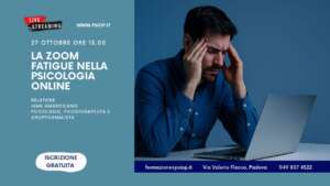 Presenteremo la Zoom Fatigue attraverso una breve rassegna delle principali ricerche e dei modelli a esse collegati. Nella seconda parte tratteremo il lavoro dello psicologo, che ha seguito lo stesso percorso portando alla digitalizzazione del lavoro clinico, entrando nel campo della clinica e approfondiremo il fenomeno della Zoom Fatigue in psicoterapia online, presentando un modello che, tenendo conto della letteratura e delle variazioni di setting e dei nuovi fenomeni a esse connessi, cerca di integrare fattori scatenanti e fattori che preservano l’efficienza mentale del clinico.